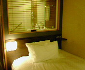 ベッドの向こう、ガラス張りでお風呂が見えるのですが、木を基調にした作りで癒され。