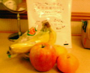 今日は果物の日だったらしく、画像のバナナ、林檎、蜜柑2個を頂いてしまいました。