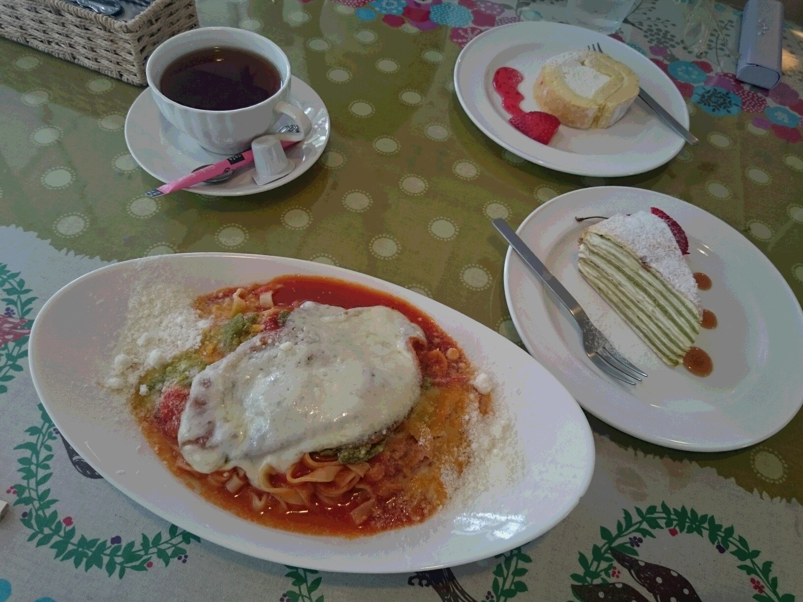 販売ブースの隣にあるカフェハッチにて、パスタランチと、ピスタチオのミルクレープを頂きました